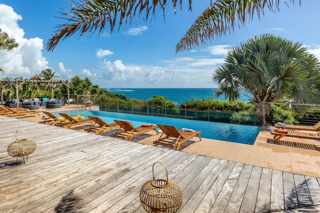 Villa 5★ rénovée, Le Villa du Cap offre un cadre idyllique face à l’océan : piscine à débordement chauffée, jacuzzi, terrasses ensoleillées et jardin tropical.